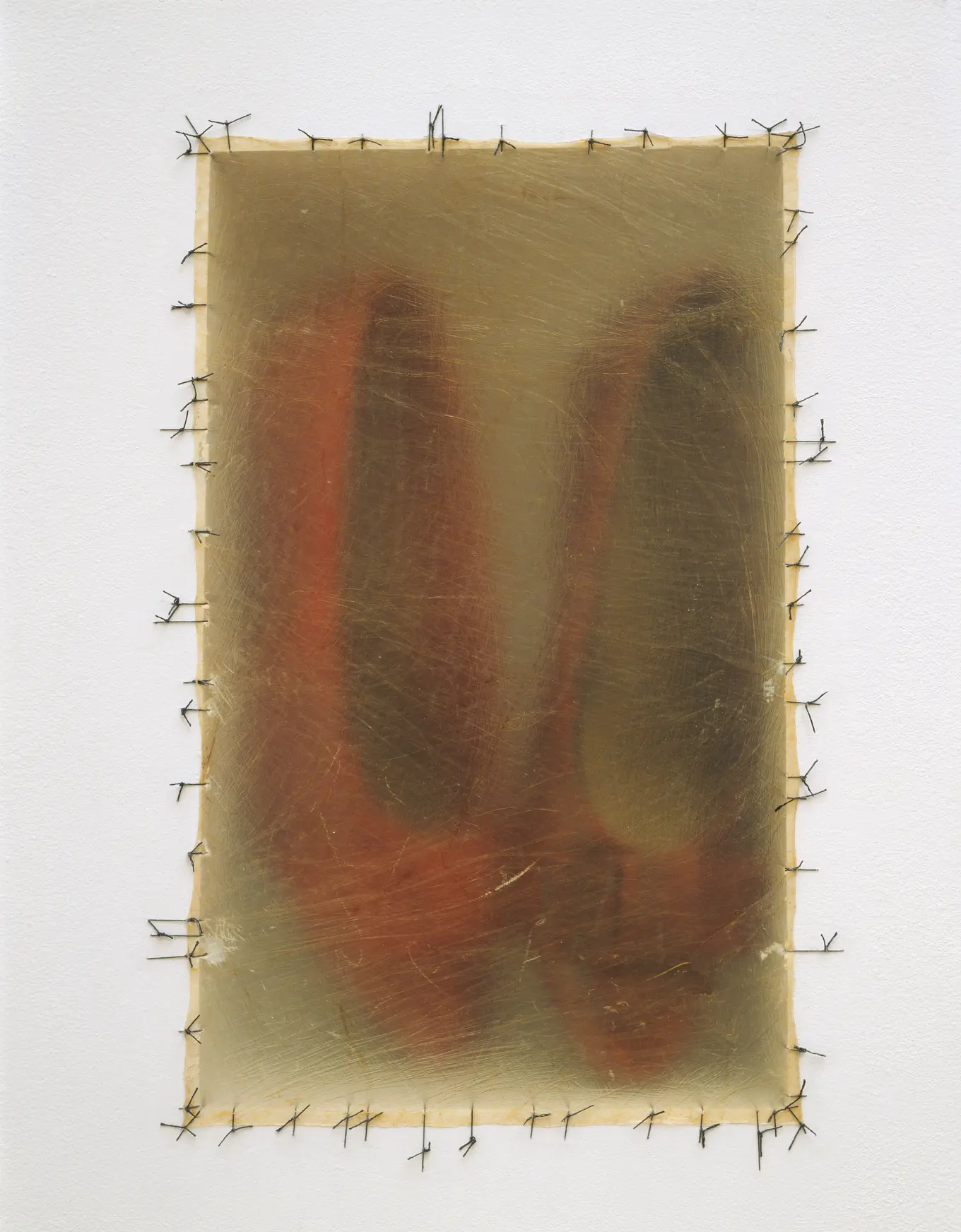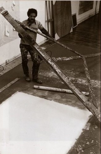 Whitten's "developer"โa twelve-foot-long wooden rake invented by the artist to move large amounts of acrylic paint in a single gesture-resulted in his "slab" paintings, large color fields defined by a single movement.